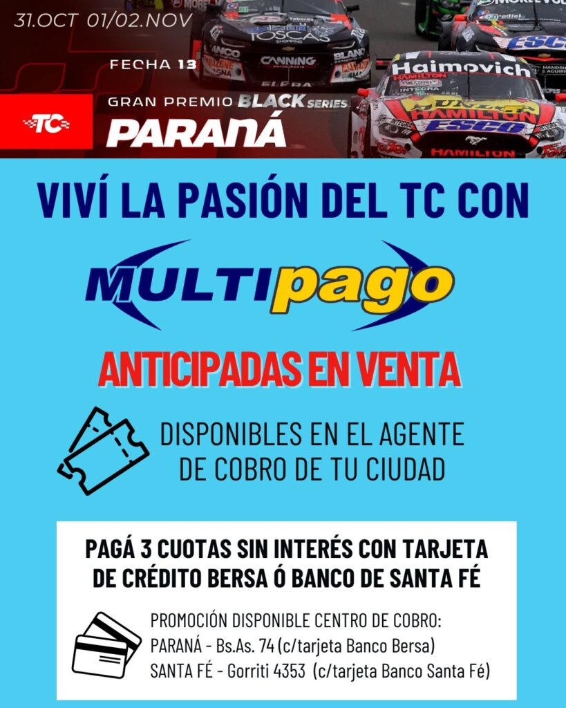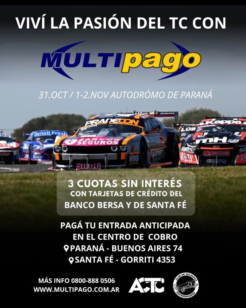 Vení a disfrutar de un fin de semana único en el autódromo enterriano. Ya podes comprar tus entradas anticipadas en el centro de cobro Multipago de tu ciudad.